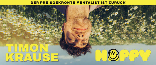 Und auch das neue Live-Programm „HAPPY 2027“ – wieder eine Mischung aus Hypnose, Mentalmagie und moderner Psychologie – bringt die Menschen zum Nachdenken, Erkennen und Verstehen, was in uns vorgeht. „HAPPY 2027“ ist keine Show, die nur Antworten gibt, sondern vielmehr die richtigen Fragen stellt – über Glück, über uns selbst, über das, was wir wirklich denken und fühlen. Timon Krause wird unterhaltsam und tiefsinnig unter Beweis stellen, dass Glück vor allem Kopfsache ist – mit viel Witz, Charme, Verstand und einem Hauch Magie.